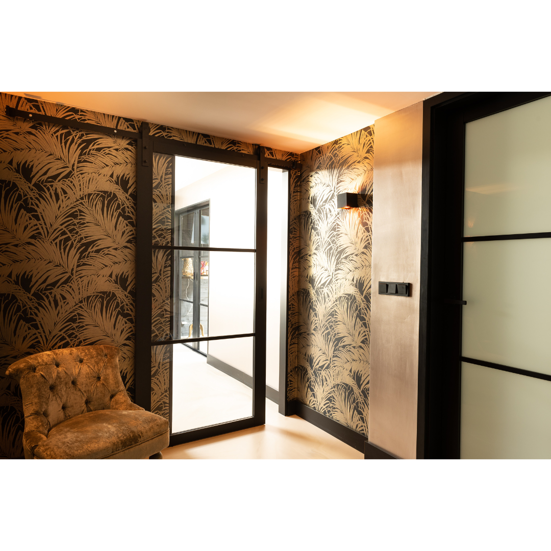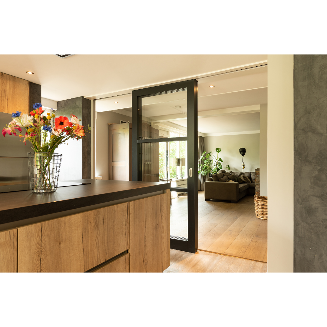 Strakke eenvoud door glas en 2 smalle lijnen geven een industrieel gevoel.