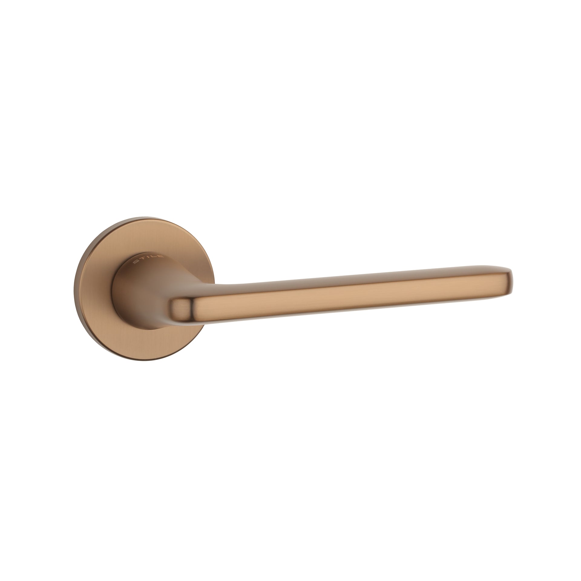 De deurklink UTA heeft een verfijnd en hedendaags design en is geplaatst op geveerde ronde rozetten van Ø 53x7 mm. Deze zijn uit één stuk gefabriceerd, wat zorgt voor een strakke, naadloze afwerking. De bijpassende onderrozetten zijn van metaal, wat garant staat voor stevigheid en een duurzame montage. De licht bruine afwerking geeft de klink een verfijnde glans die perfect past bij moderne interieurs.